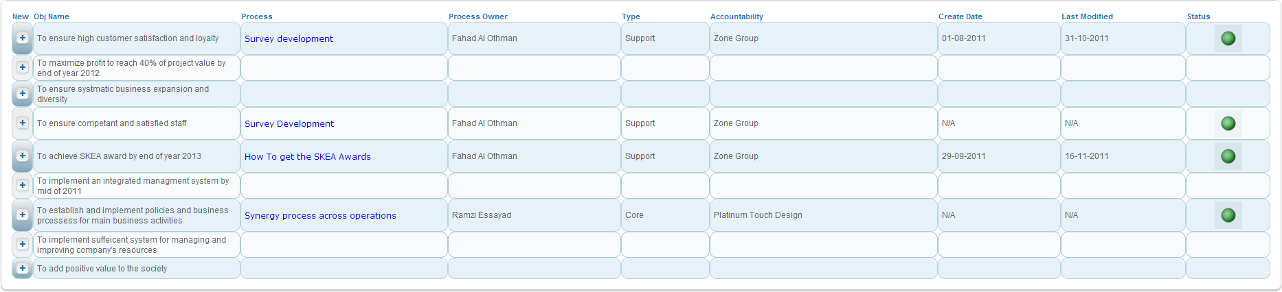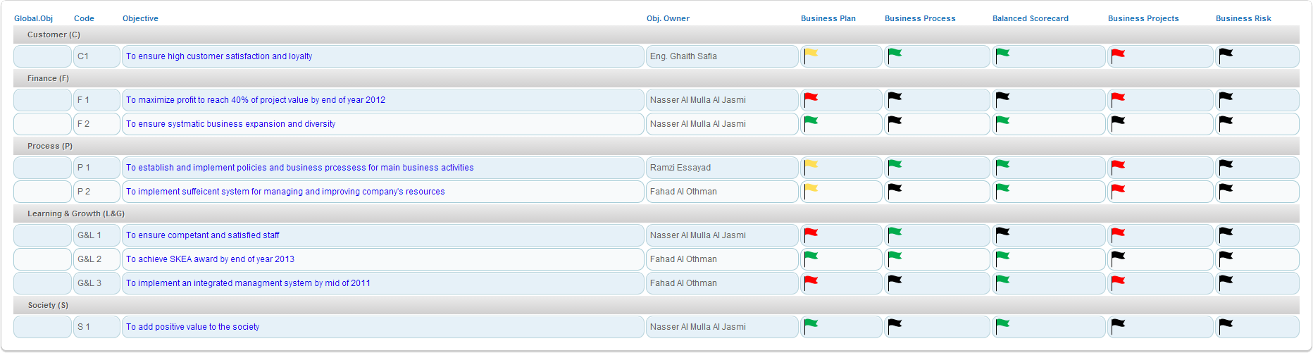 The Strategic Framework allows for the capturing of the vision, mission, value statements and objectives of the organization. It also provides a simple technique by which the organization can monitor how well it is achieving its objectives from five main perspectives, i.e. – Performance, Business Planning, Processes, Projects and Risk. A traffic light system (Red, Amber, Green and black) gives the manager an up to date view of how well his/her department is doing with regards to the achievement of their objectives.